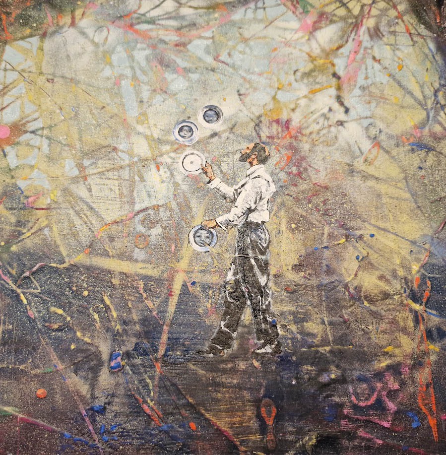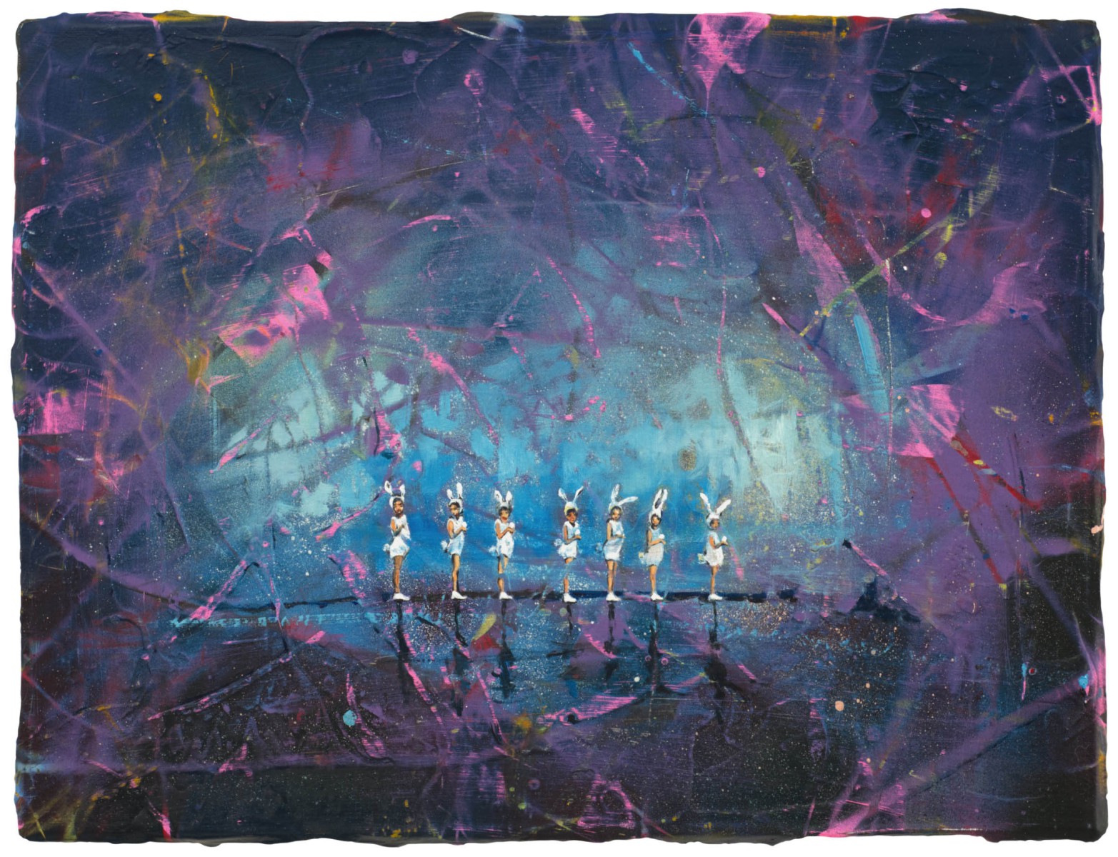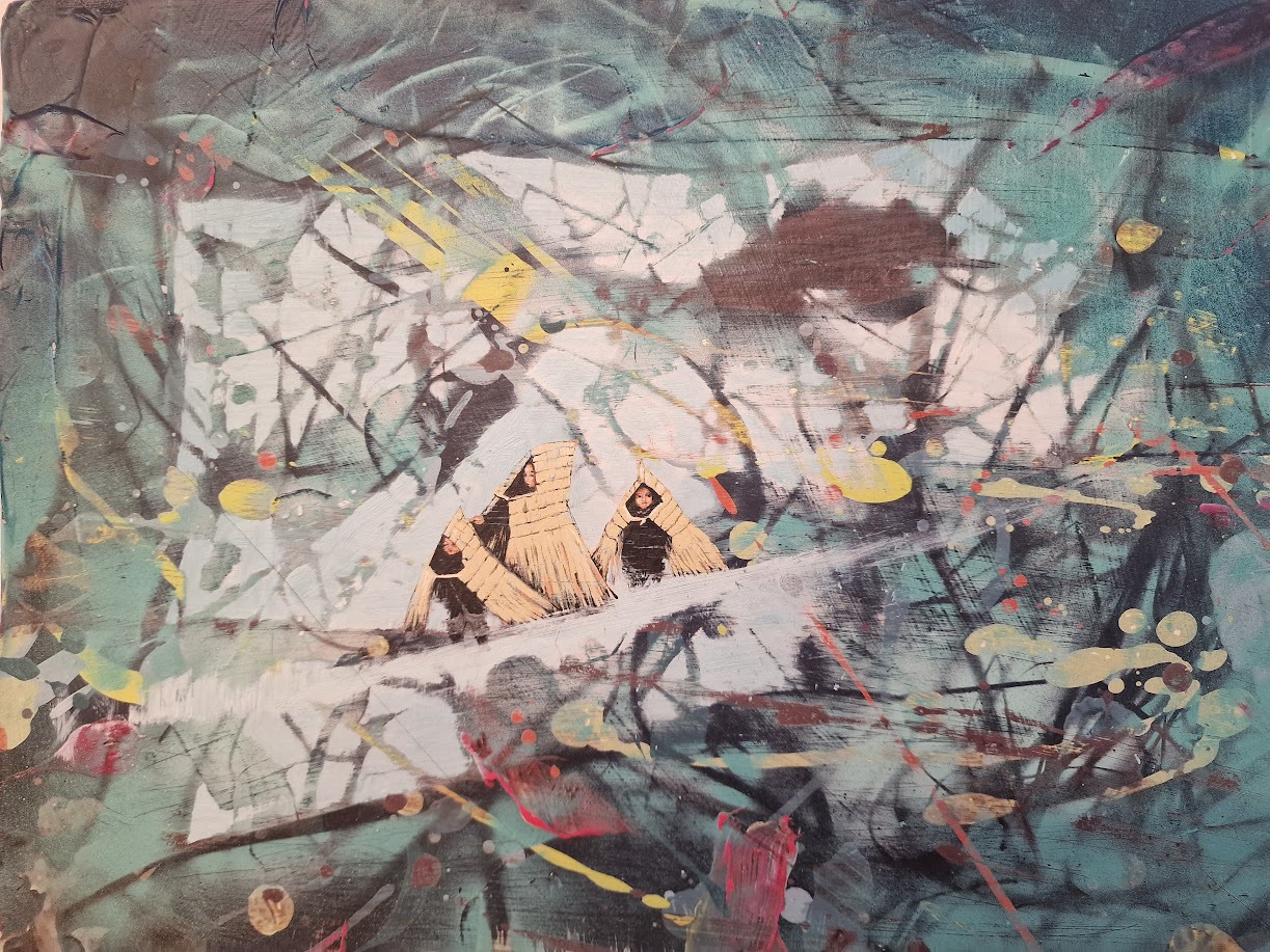 Die Menschen auf den Bildern sind oft winzig. Däumlinge, die unbeirrt tun, was in psychedelischen Dämpfen zu tun ist: Gymnastik, Kreistänze, Yoga oder einfach nur in die Wunderwelt hineinstaunen. Das sind Rest-Märchen-Akteure in Baumwipfeln, die ihre Ruhezonen in Farbschlieren suchen.