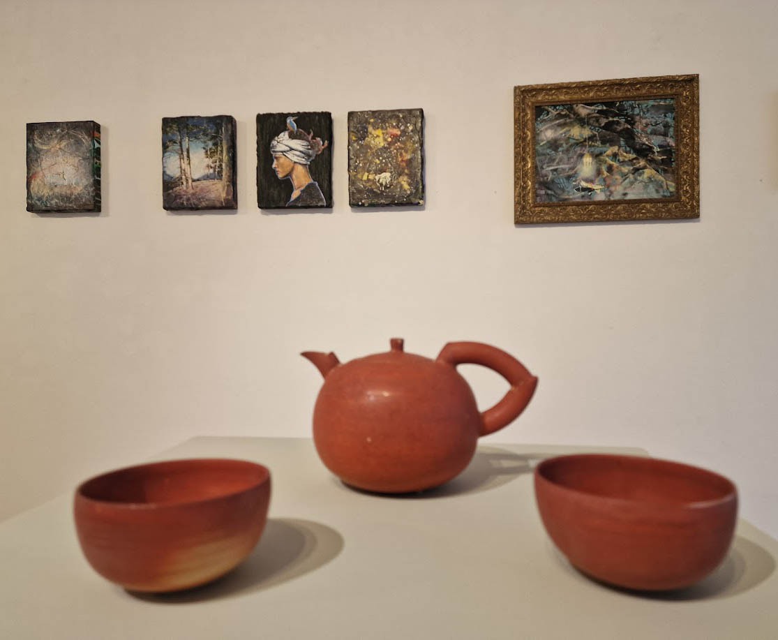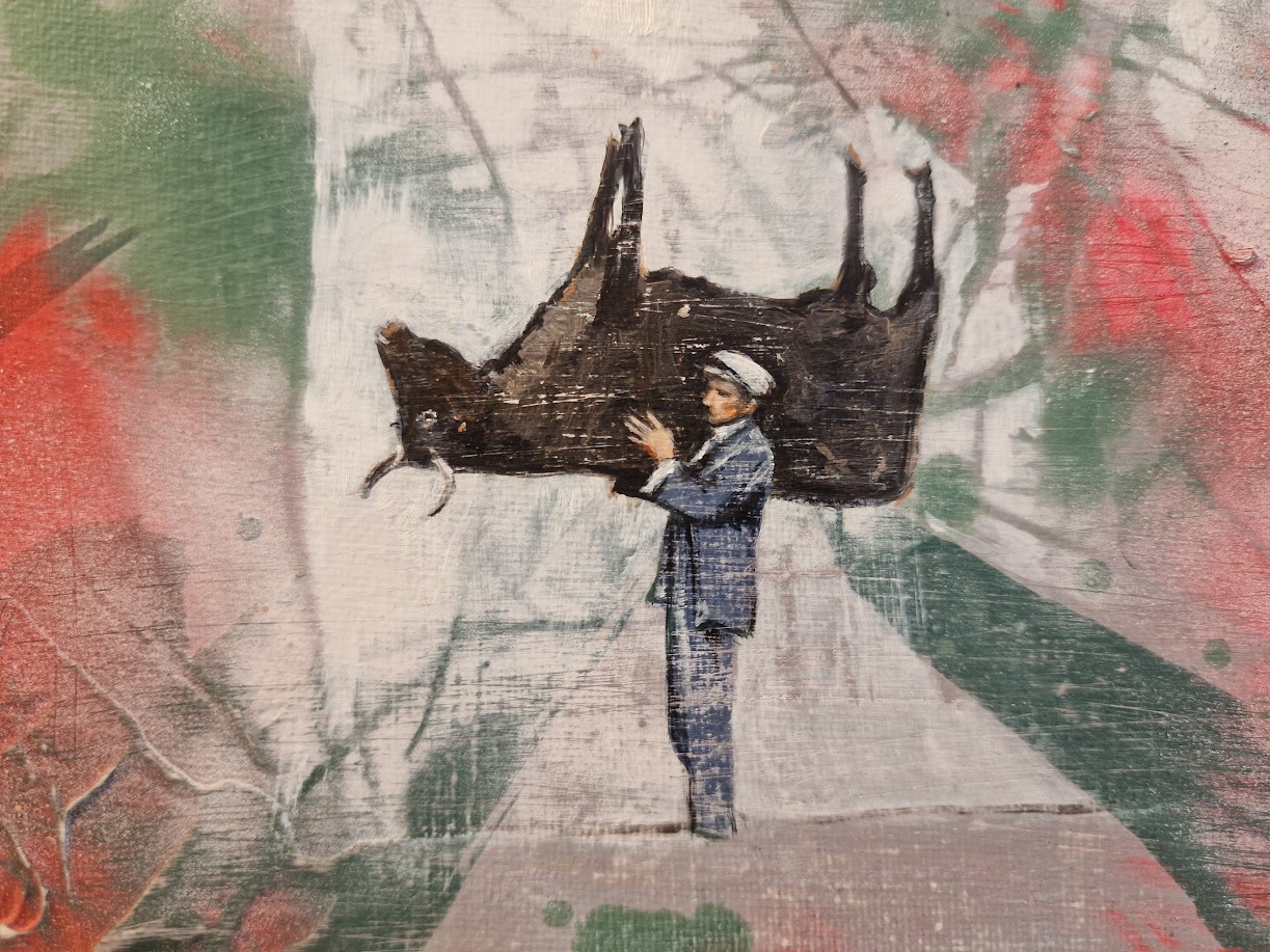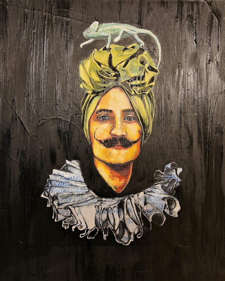 Diese Bildelemente stecken im Nebel wie kleine Fehlstellen. Und diese kleinen Details erklären das ganze Bild. Oder auch nicht, wie bei dem Bild der jungen Frau mit dem Eisvogel auf dem Kopf. Betitelt mit „Tacende“, kommt aus dem Latein und bedeutet „Dinge, die besser ungesagt bleiben, nicht öffentlich gemacht werden oder die man beiseite lassen sollte“, also schweigen.
